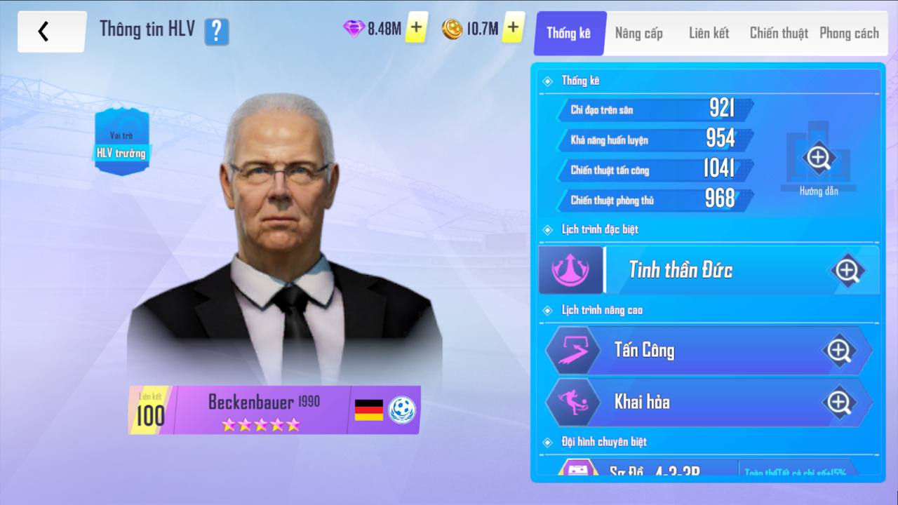 + Beckenbauer: 2 CT biết Chuyền bất kỳ trong đó cần có 1 Tiền Vệ, 1 ST biết Dứt Điểm (Tinh Thần Đức, Tấn Công, Khai Hỏa)