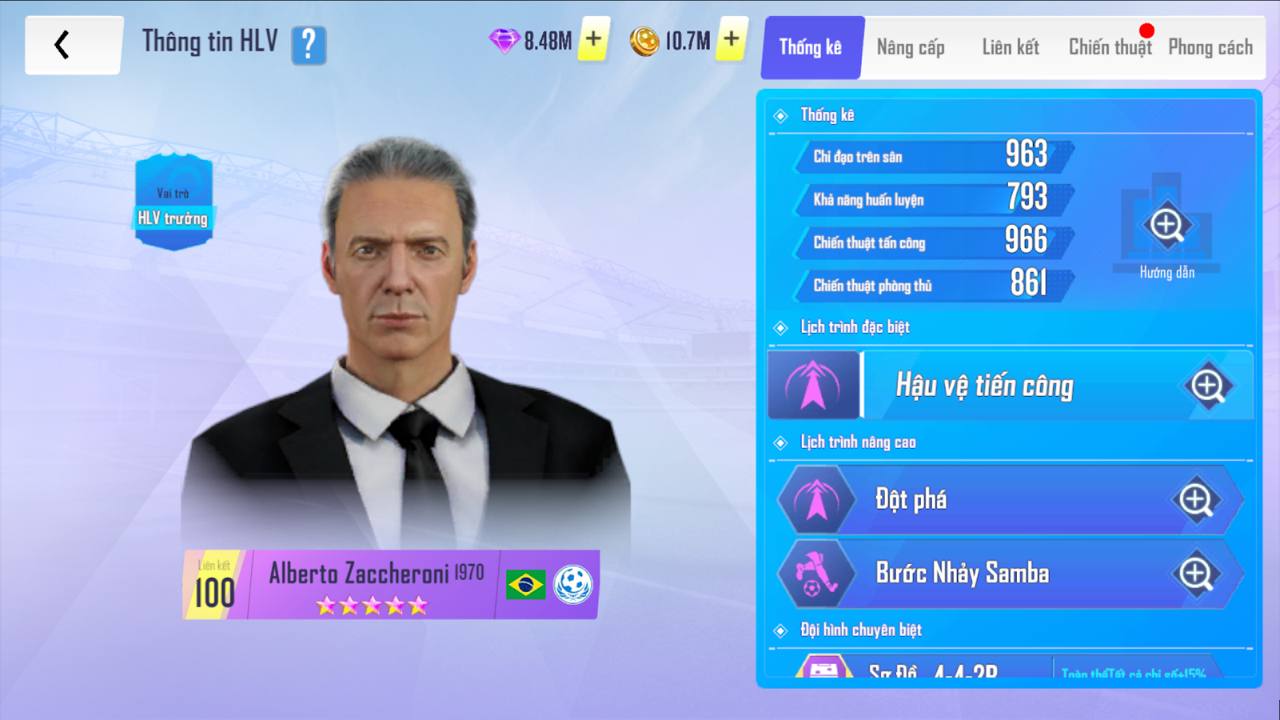 + Alberto Zaccheroni: 1 Hậu vệ Biên biết Rê bất kỳ, 1 đến 2 CT biết Chuyền bất kỳ, 1 ST và có thể chọn thêm 1 CT bất kỳ biết Dứt Điểm (Hậu Vệ Tiến Công, Đột Phá, Bước Nhảy Samba)